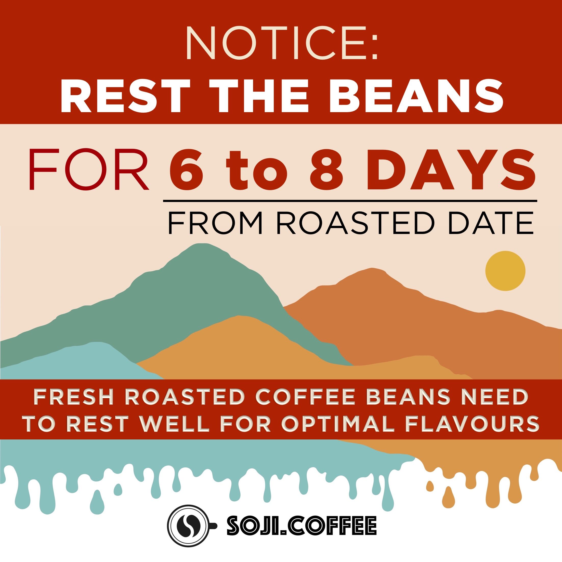 *RECOMMENDED TO REST BEANS : 6 – 8 DAYS FROM ROAST DATE.